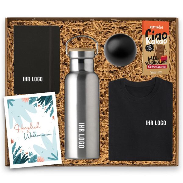 Das perfekte Welcome-Kit für neue Mitarbeiter oder Kunden. Die T-Shirt Größe können Sie ganz individuell nach der Bestellung mit uns abstimmen. Auch das Design und die Farbe der einzelnen Produkte besprechen wir nach der Bestellung. Darüber hinaus können Sie das Design der Box selbst gestalten. Die Kreativität kennt hier keine Grenzen. Auf Wunsch liefern wir die Geschenkbox direkt an Ihre Empfänger.