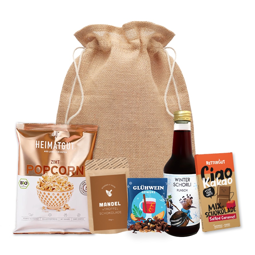 Jeder Weihnachtsbeutel wird individuell erstellt und ist gefüllt mit einer Auswahl weihnachtlicher Produkte. Insgesamt warten 4 großartige und mit Liebe und Sorgfalt ausgewählte Produkte auf Sie. Mit dem Inhalt des Weihnachtsbeutels wollen wir besonders eins, begeistern und überraschen. Mit dem Kauf des Mitarbeitergeschenks unterstützen Sie 100% lokale Unternehmen und tun zeitgleich der Umwelt etwas Gutes.